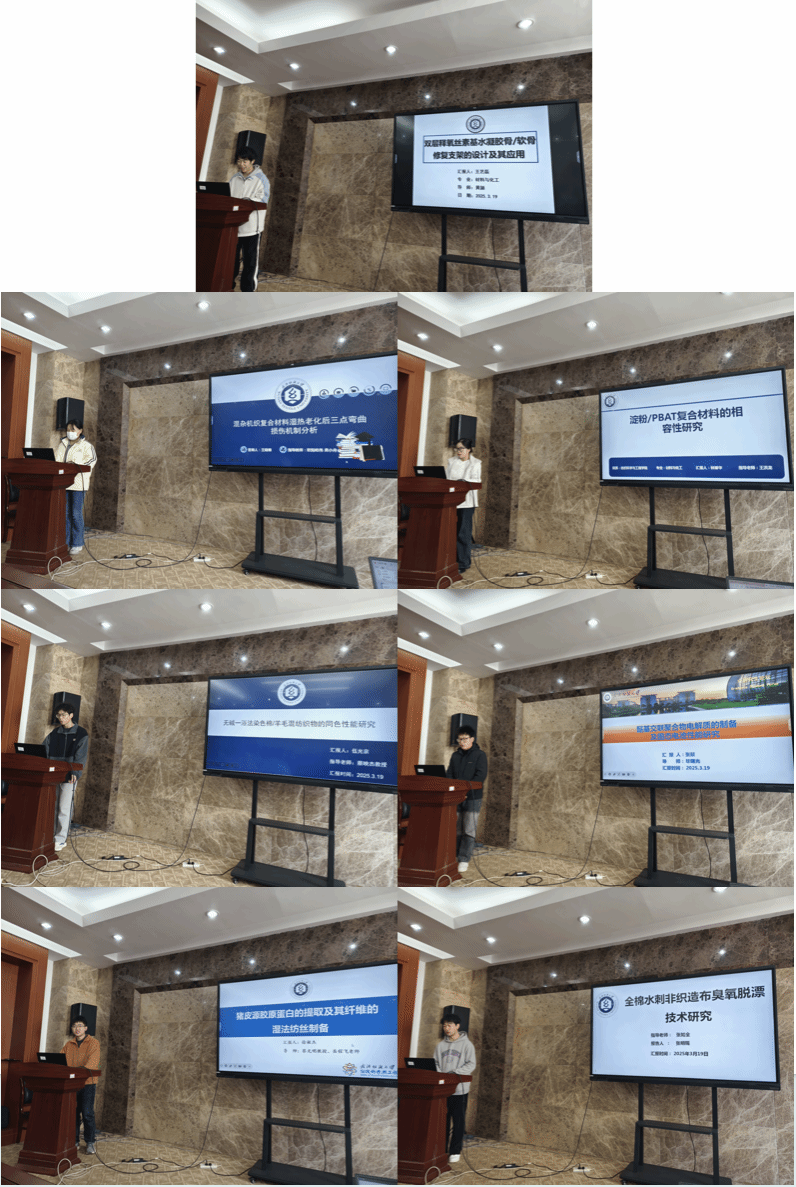 论坛上,王艺磊、王晓楠、林卿华、伍光宗、张燚、徐敏杰、张明赐七位同学依次介绍了自己的研究课题和目前取得的研究进展,并分享了自己的科研经验。主讲同学研究课题包括,双层释氧丝素基水凝胶骨/软骨修复支架的设计及其应用、混杂机织复合材料热老化后三点弯曲损伤机制分析、淀粉/PBAT复合材料的相容性研究、无碱—浴法染色棉/羊毛混纺织物的同色性能研究、醚基交联聚合物电解质的制备及固态电池性能研究、超声波辅助酶法提取精皮胶原蛋白的工艺优化及胶原纤维的湿法纺丝制备、全棉水刺非织造布臭氧脱漂技术研究。这些研究课题契合了“纺织新材料及绿色加工”主题,代表了学院最新研究进展,参会人员积极提出问题和建议,营造了良好的学术氛围。
