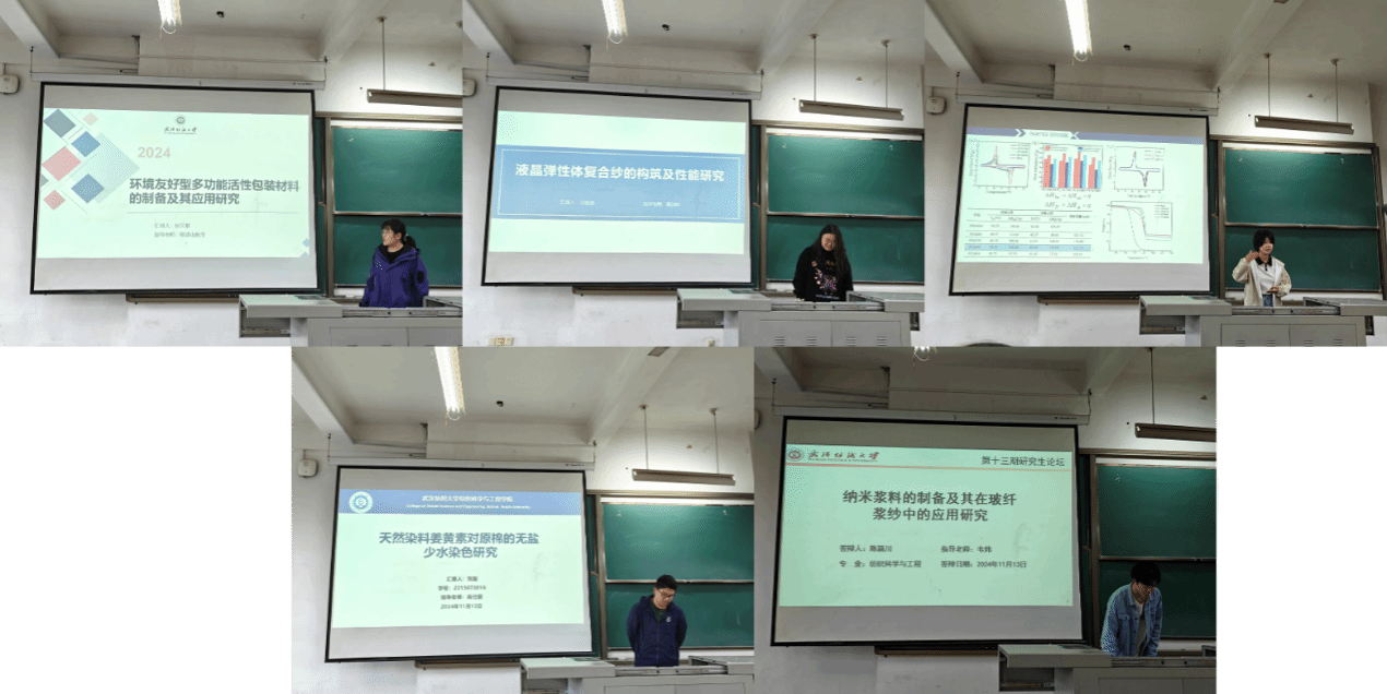 论坛上,张文雅、汪彬涵、李巍巍、刘磊、陈颖川五位同学依次介绍了自己的研究课题和目前取得的研究进展,并分享了自己的科研经验。主讲同学的研究课题包括环境友好型多功能活性包装材料、液晶弹性体复合纱、溶液喷射纺蒲草基相变PAN纤维、天然染料姜黄素、纳米浆料,契合了“纺织新材料及绿色加工”主题,代表了学院最新研究进展,参会人员积极提出问题和建议,营造了良好的学术氛围。