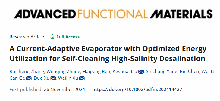 刘可帅课题组在国际著名材料期刊《Advanced Functional Materials》上发表了题目为“A current-adaptive evaporator with optimized energy utilization for self-cleaning high-salinity desalination”的研究成果。论文的第一署名单位为国产直播