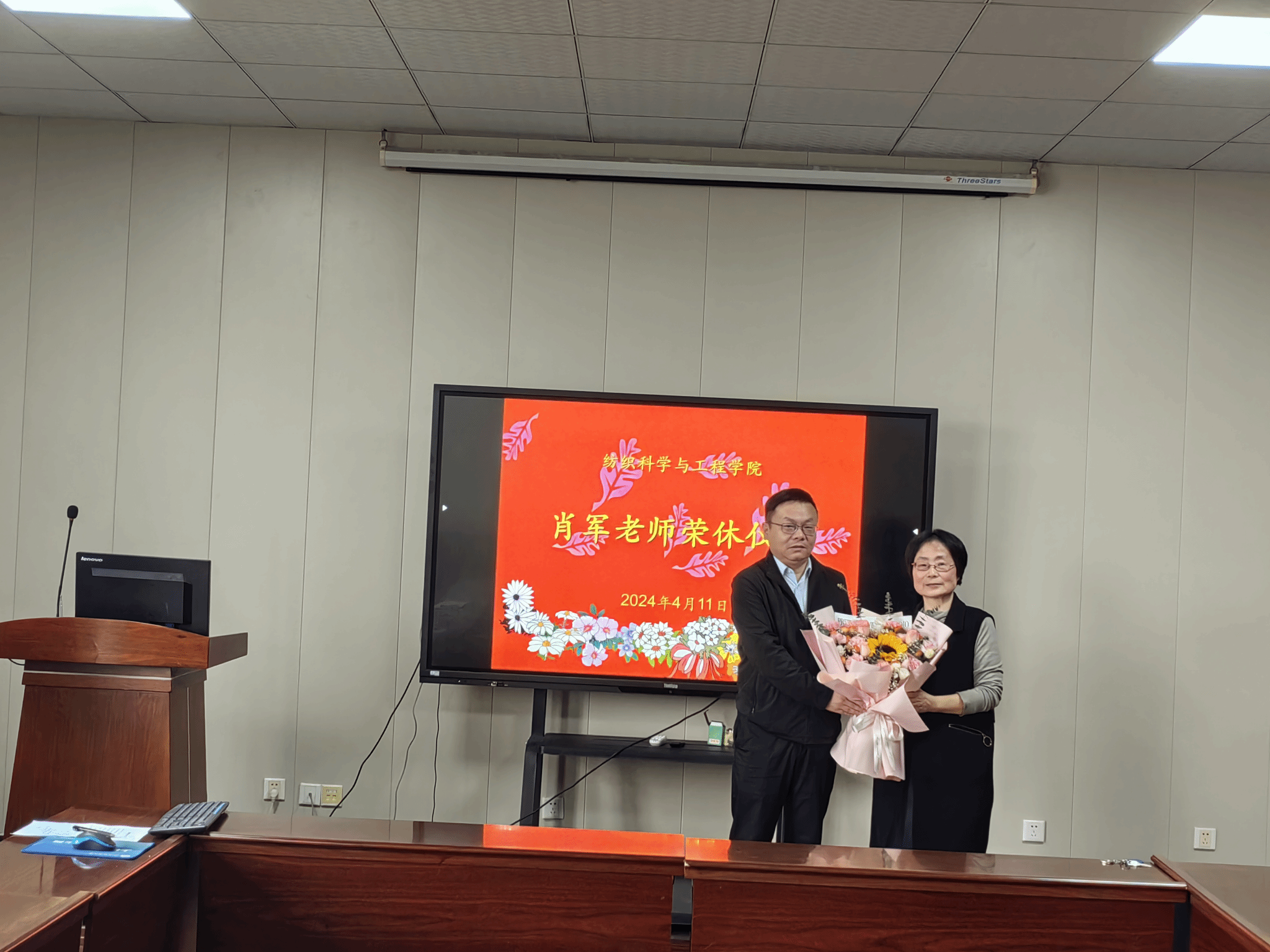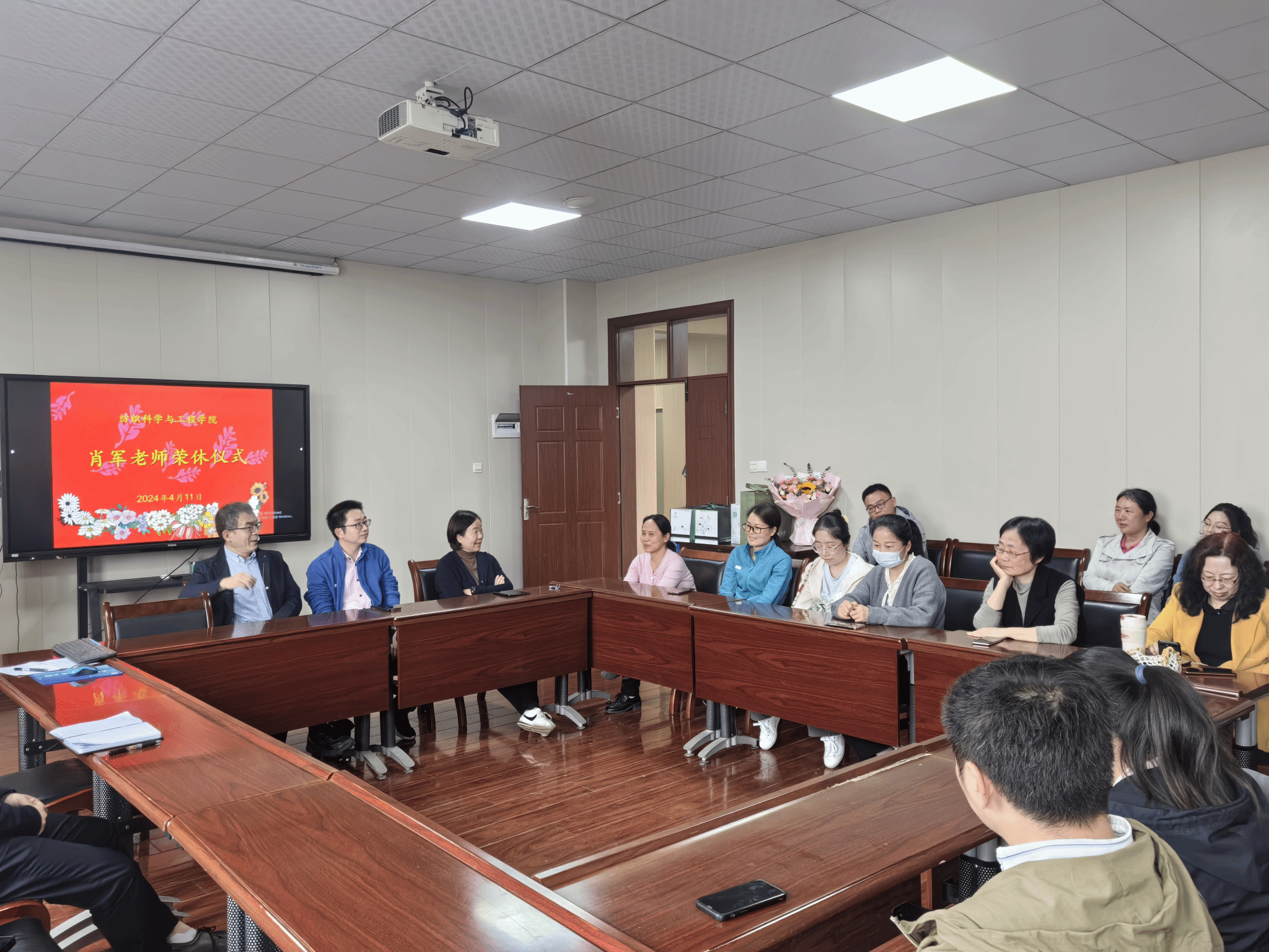 在8H502会议室举行了学院肖军老师的荣休仪式。学院领导班子、《织物组织与结构学》课程组成员及其他部分教师代表共同见证了这一温暖与感恩的时刻,仪式由工会主席曹新旺主持。