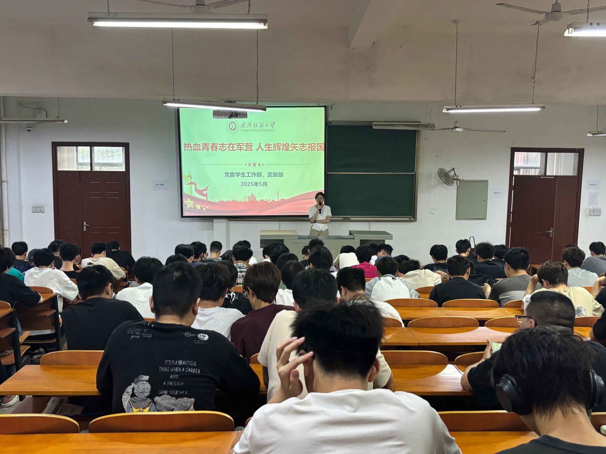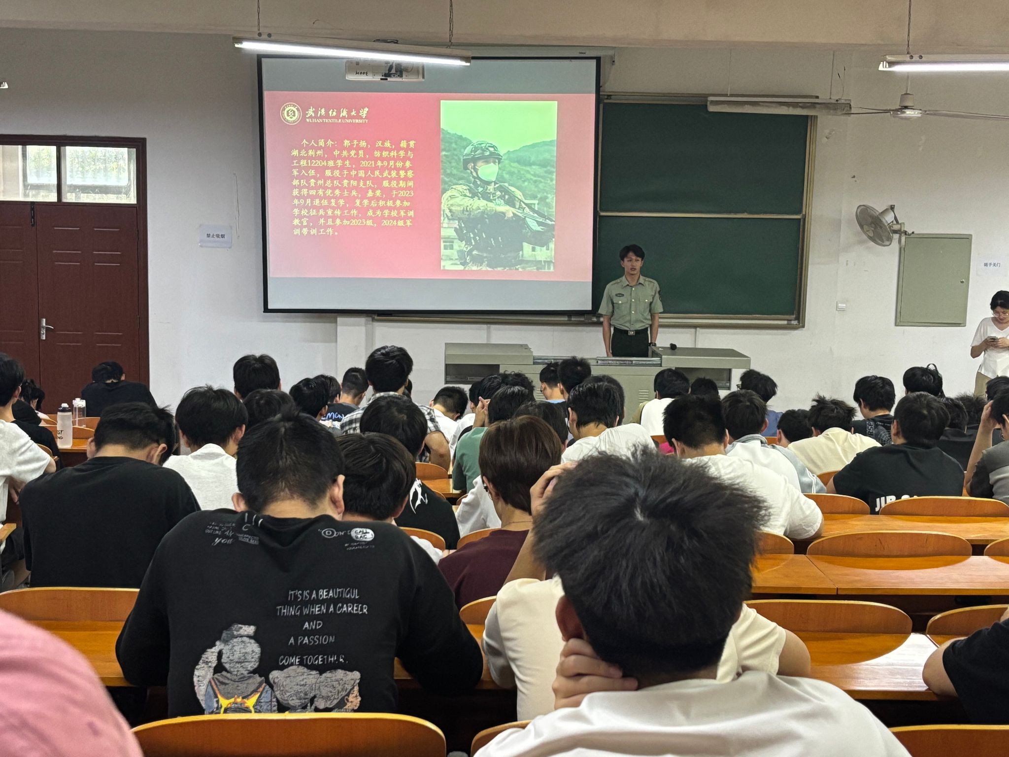 纺织工程12204班退伍大学生郭子扬结合自己的从军经历,鼓励广大青年学子将个人追求融入国家,积极报名参军,到军营建功立业。他从为什么鼓励大学生参军、应征入伍满足的基本条件、大学毕业生入伍优待政策等方面回应了大学生入伍相关的问题。重点强调了大学生应征入伍特有的补偿学费、就业创业优惠等优抚政策,让同学们进一步了解了征兵工作要求和军旅生活。