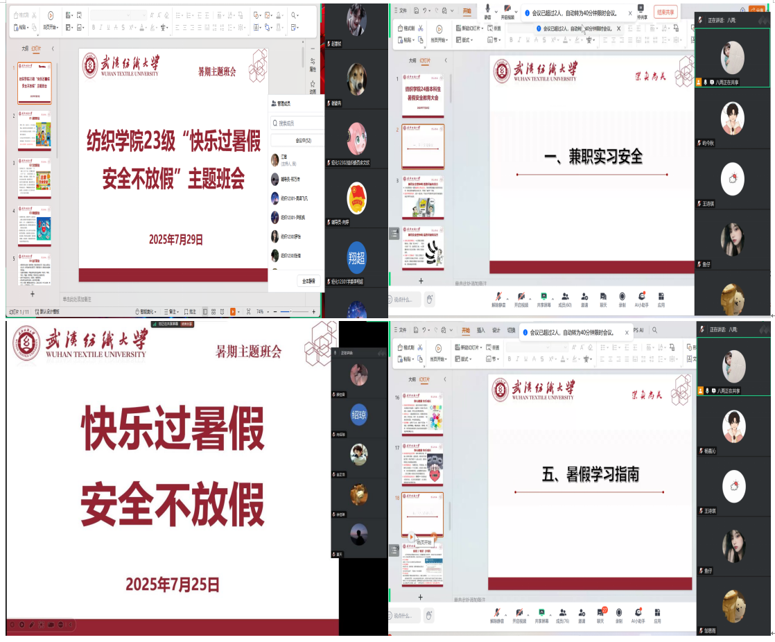 安全无假期,防范于未然。纺织学院始终将学生安全工作放在首位,此次暑期安全教育主题班会的成功举办不仅有效提升了学生的安全意识和自我保护能力,更为全院学生平安、健康、充实地度过暑假提供了坚实保障。学院将继续创新安全教育形式,筑牢校园安全防线,为学生的成长成才保驾护航。
