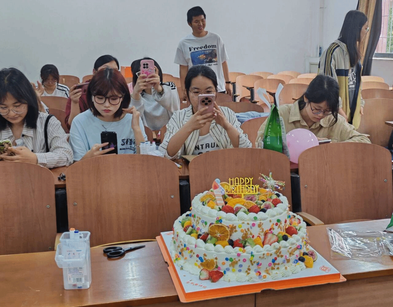 活动最后大家合影留念。将艺术疗愈融入集体生日会,是心理健康教育形式的一次创新尝试。通过非语言表达和团队共创,学生得以释放压力,同时强化了朋辈支持网络。后续,学院将持续探索“艺术+心理”的多元化育人路径,助力学生身心协调发展。