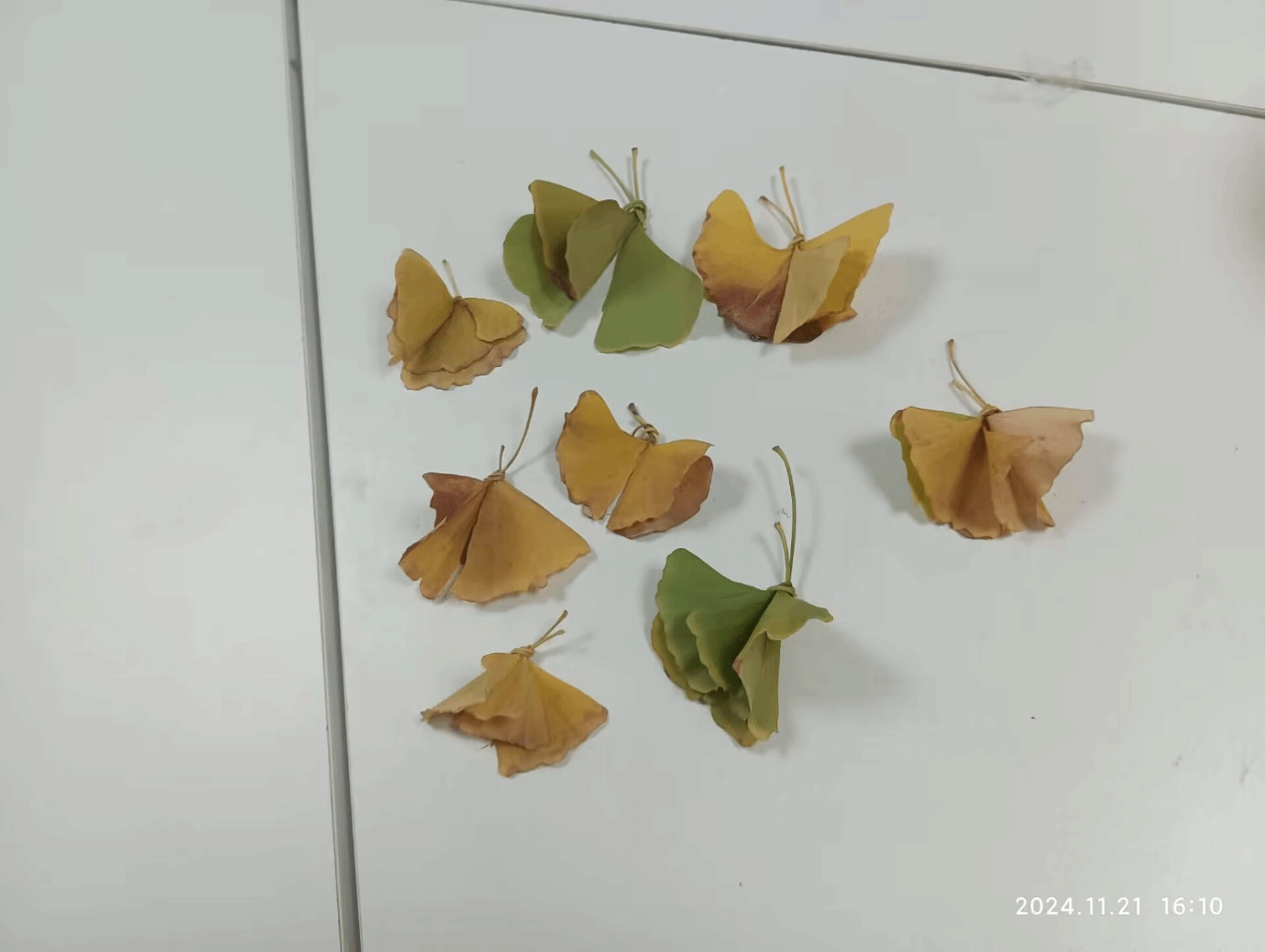 随后,主持人向同学们播放了做银杏蝴蝶的教程,简单讲解了制作的基本注意事项等。同学们纷纷沉浸在制作当中,两片简简单单的银杏叶,经过同学们的巧手,变成了活灵活现的小金色蝴蝶。不同大小不同姿态的蝴蝶,为我们述说秋天末尾的故事。