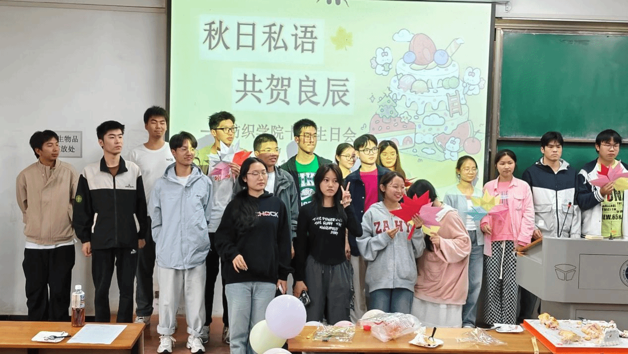 在3教118成功举办以“秋日私语,共贺良辰”为主题的2025级新生集体生日。19名新生寿星及织心湾全体成员参加活动。