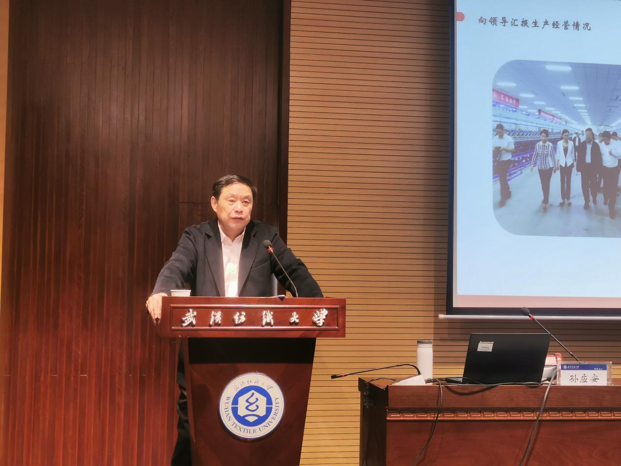 的求学生涯,感慨到学校发展迅速、科技学术成果丰硕,并向同学们分享自己从事纺织行业四十余年的职业经历,引导同学们树立专业自信心、立好专业报国志。孙应安向同学们详细讲解了湖北孝棉实业集团有限责任公司的发展历程与行业地位,着重与同学们分享了企业响应国家一带一路政策号召,积极实行产业援疆企业改革的故事,展现纺织企业家以人民为中心、以党和国家需要为根本的家国情怀。随后他表示纺织行业是民生行业,是经济支柱产业,更是出口创汇行业,具有强大的生命力与坚韧性,未来发展建设大有可为。