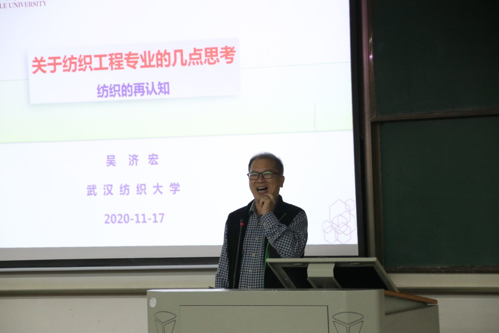 于11月16日上午9点,在3H102开展了“纺织再认识”讲座,本次讲座出席的人有教授吴济宏,党委副书记陈海书记和辅导员吴童玲,讲座由吴济宏主讲。