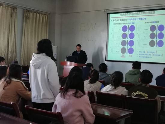 王教授就自己最近的学术研究进展和心得与大家进行了深入交流与分享。着重介绍了静电纺丝的优势、种类、结构及超细纤维在纳米蛛网传感器制造,表面能梯度和差动毛细效应驱动单向导湿和防水透湿纳米纤维膜,以及非织造布仿生树状分叉结构且环境友好型光催化自清洁纳米纤维膜等方面的内容。学院老师和同学与王教授进行了提问和充分交流,并与王教授探讨、请教了静电纺丝领域的一些前瞻性和共性问题。老师和同学们纷纷表示本次讲座开阔了视野,收获很大,期待学院今后更多举办类似的学术讲座,提高学院的科研和学术氛围。