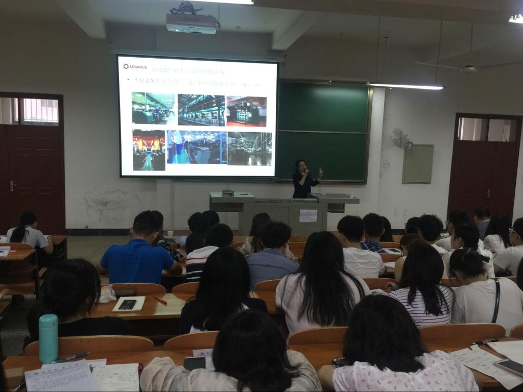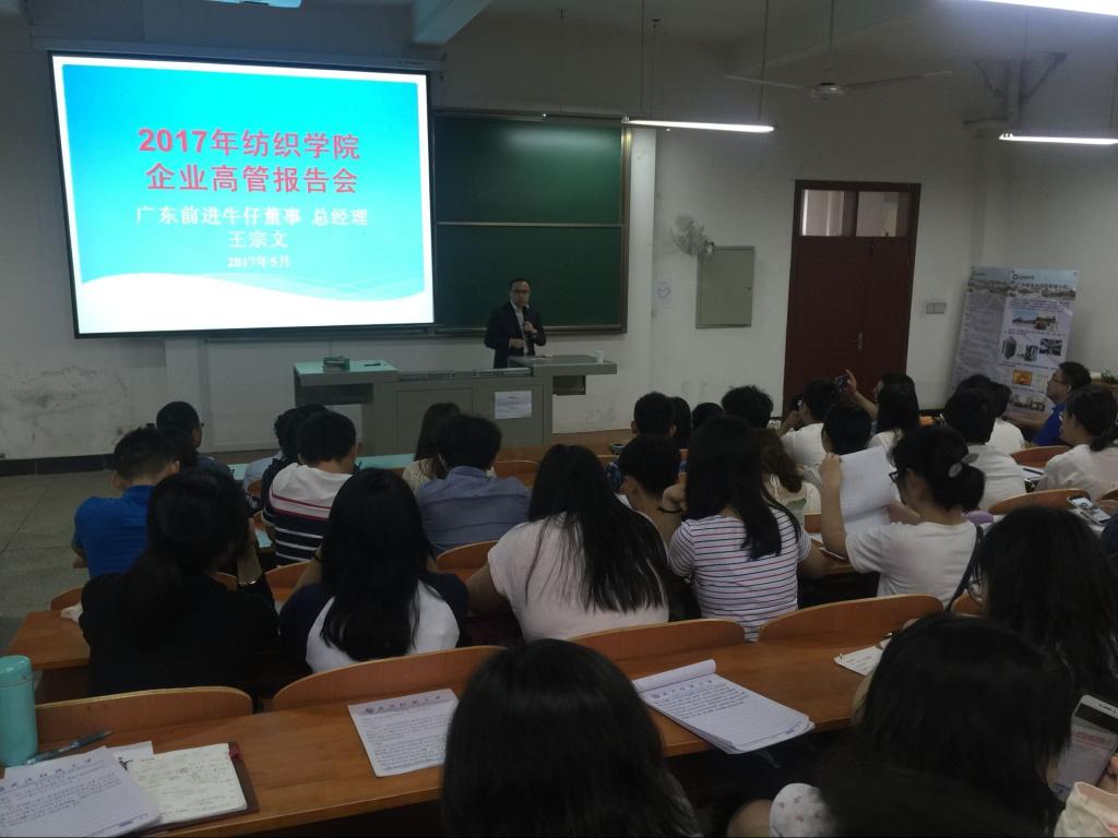 毕业之后就进入广东前进牛仔公司,从基层一线做起直至今日。王女士用自己二十多年来的前身经历来讲解,我们应该如何去选择未来,如何去选择平台。告诫我们要干一行爱一行,要对事情保持专注,不要三心二意,要坚持纺织行业,从基层做起,其中大有作为。王宗文女士十分风趣幽默,不时博得同学们的掌声和笑声。