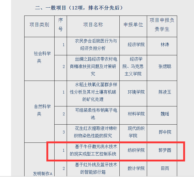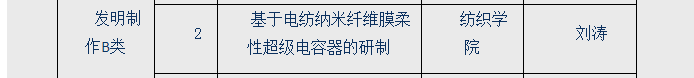 共有两项学生课外科技学术作品入围。其中由韦炜老师指导的非织11402班学生刘涛个人作品《基于电纺纳米纤维膜柔性超级电容器的研制》入围重点项目,由易长海教授指导的纺织11402班学生郭梦圆团队作品《基于牛仔激光洗水技术的现实成型工艺控制系统》入围一般项目。