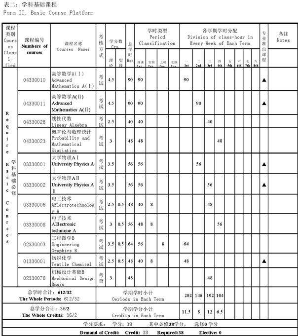 Advanced Mathematics A(Ⅰ)、Advanced Mathematics A(Ⅱ)、College Physics A(I)、College Physics A(Ⅱ)、Fiber Chemistry.