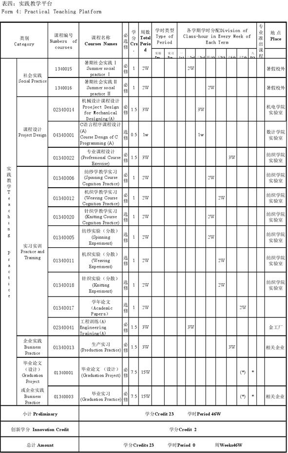 军训、社会实践、专业课程实验、纺织现场教学实习、工程训练I、生产实习、学年论文、机械设计课程设计、专业课程设计、毕业设计(论文)或毕业实习。