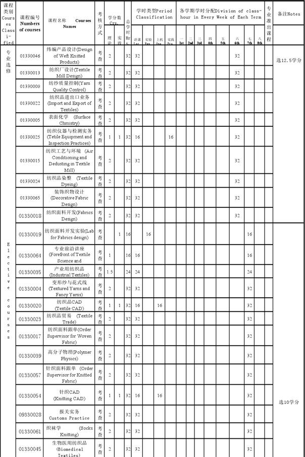 ① 纺织材料学、纺织材料实验技术 ② 织物组织与结构、织物组织与结构实验 ③ 纺纱学 ④ 针织学(纬编)、针织学(经编)⑤ 机织学、⑥ 非织造学(6门课程修11学分)。