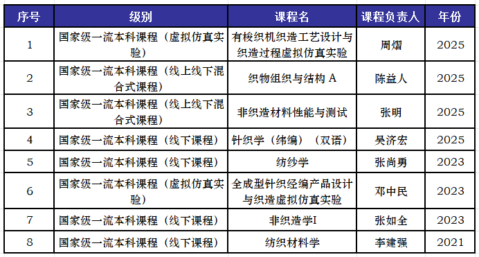 申报的《有梭织机织造工艺设计与织造过程虚拟仿真实验》、《织物组织与结构 A》、《非织造材料性能与测试》、《针织学(纬编)(双语)》四门课程获批国家一流本科课程。