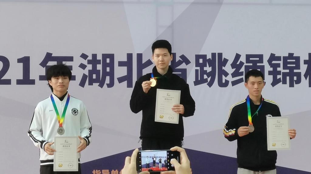 敢于挑战和追求卓越是郭世贸同学的对自己的要求,2020年10月,郭世贸同学首次作为跳绳运动员代表学校出战湖北省跳绳竞标赛,在这场包括武汉体育学院、中南民族大学等老牌强校运动员的厮杀中,成功为学校收揽两枚金牌和两枚铜牌(包括学校在该项赛事上的首金),其中在“男子30秒双摇”项目打破赛会纪录,而在这优异成绩的背后,是他日复一日5000次跳绳早训计划的坚守,他深知:能在全省最高级别赛场上较量的运动员都是拥有绝佳天赋的选手,比的就是谁的失误更少、发挥更稳定。刻苦的训练是绕不过的坎儿。
