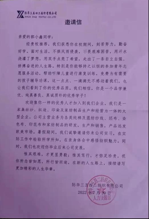 襄阳地区就业实习实训基地、优秀合作企业际华三五四二纺织有限公司听闻学生事迹后深受感动,第一时间发出邀请信,邀请郭小鑫同学假期到公司实习,在实际工作中检验所学所知,在亲身体会中感悟纺织魅力,同时邀约其毕业后到公司发展,接续谱写人生华章。