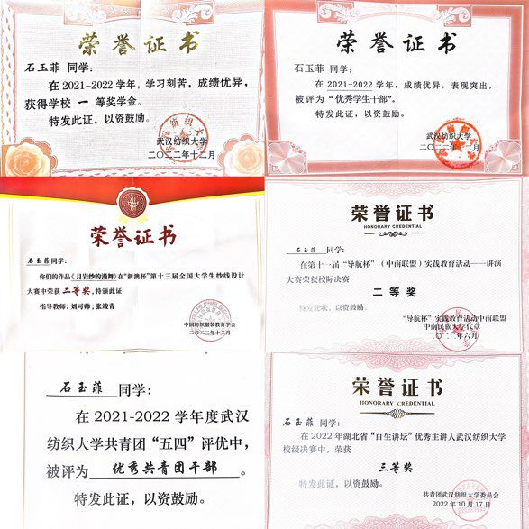 作为一名学生干部,她学年综合成绩排名班级第一,曾获得学校一等奖学金,顺利获得英语四级证书。她现担任纺织工程52103班团支书以及纺织12207班副班主任两职,与其他班委带领班级获得了“先进班级”称号,曾获得“优秀学生干部”、连续两年被评“优秀共青团干部”等荣誉称号。在大一期间,她便加入到课题组3051学习,并积极参与各类竞赛,参加“润尼尔杯”全国大学生训练综合能力大赛、中国互联网大学生创新创业大赛等比赛,在大学生创新创业大赛中获得校级立项,在第十三届“新澳杯”全国大学生纱线设计大赛中获得个人二等奖。在近距离的了解纺织专业后,让她产生了极大的兴趣,更萌生了希望能够继续深度参与其中的念头。