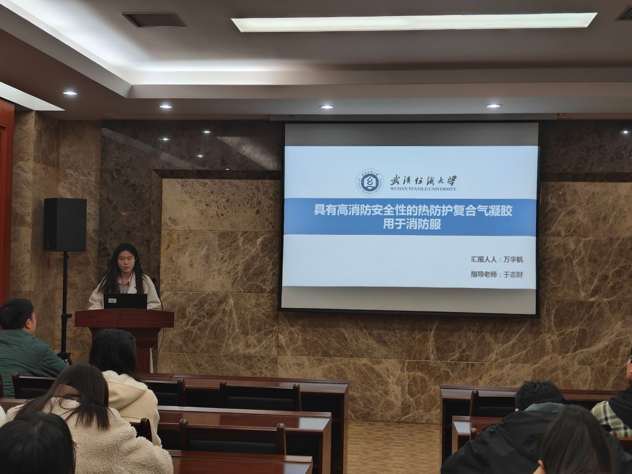 论坛上,李思雨、江庆、钱赛龙、万宇航、张莎莎五位同学依次介绍了自己的研究课题和目前取得的研究进展,并分享了自己的科研经验。主讲同学的研究课题包括汉麻黄酮类物质的提取及其在功能纺织品上的应用、自修复热电纤维基柔性可穿戴火灾预警传感器、基于纤维素纤维调控的活性染料清洁染色、具有高消防安全性的热防护复合气凝胶用于消防服、微环境空气层保暖材料设计及应用,契合了“纺织新材料及绿色加工”主题,代表了学院最新研究进展,参会人员积极提出问题和建议,营造了良好的学术氛围。