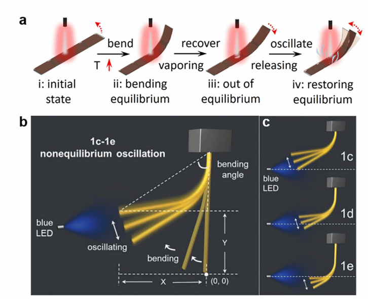 当前难以通过遮蔽发散光来实现自振荡。Liu等人基于多孔聚丙烯薄膜在近红外发散光下的光热溶剂蒸发和吸附衍生的交替体积膨胀和收缩实现了自振荡运动(图3a)。在800 mW cm-2的近红外光照射下,致动器产生微小波动,直至薄膜内部溶剂吸脱附达到平衡时,产生稳定的左右弯曲振荡(图3b)。振荡周期约为0.3秒获得的振荡位移为15.7mm。特别地,在溶剂连续供应和恒定的光照下,振荡运动永远不会停止。