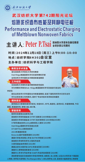 Professor Peter P. Tsai, a retired and adjunct professor at the University of Tennessee, was invited to visit our college on the morning of December 18, 2024, to give an offline academic report for the teachers and students of our college. The title of the academic report is: "Properties and Electrostatic Charging of Meltblown Nonwoven Fabrics". The academic report was chaired by Professor Liu Yanbo. Professor Liu Yanbo and some teachers of the college listened to the report and participated in the exchange and discussion in the 8H302 conference room of the college. A large number of teachers and students also listened to this academic report.