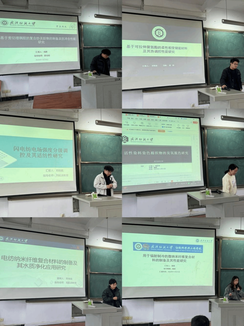 论坛上,邓田凯、郑佳佳、陈思琴、潘慧、何智涛、肖鹏六位同学依次介绍了自己的研究课题和目前取得的研究进展,并分享了自己的科研经验。主讲同学的研究课题包括闪电纺丝过程中电场强度分级调控及其适纺性研究、电纺纳米纤维复合材料的制备及其水质净化应用研究、活性染料染色棉织物的臭氧脱色研究、用于辐射制冷的微纳米纤维复合材料的制备及其性能研究、基于可拉伸聚氨酯的柔性相变储能材料及其热调控性性能研究、基于剪切增稠剂的复合纱及织物制备与抗冲击性能研究,契合了“纺织新材料及绿色加工”主题,代表了学院最新研究进展,参会人员积极提出问题和建议,营造了良好的学术氛围。