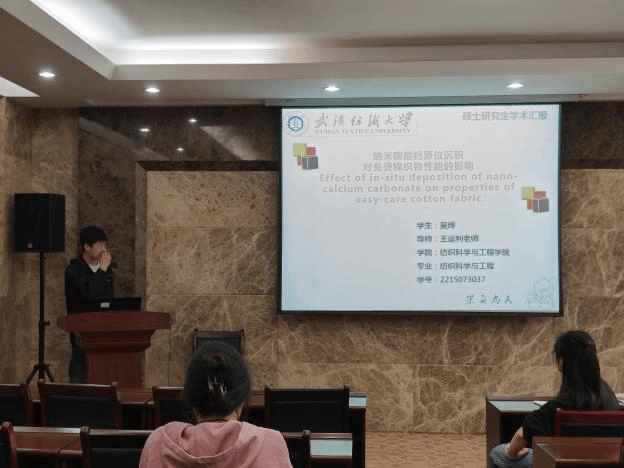 论坛上,力一颖、黄建、陈莹、邵晓宇、宋瑶和吴烨六位同学依次介绍了自己的研究课题和目前取得的研究进展,并分享了自己的科研经验。主讲同学的研究课题包括荧光碳量子点、丝素粉体、葡萄糖与聚谷氨酸生物基美拉德反应产物、纤维素/MOF复合纤维、玄武岩三维机织管状复合材料、免烫棉织物,契合了“纺织新材料及绿色加工”主题,代表了学院最新研究进展,参会人员积极提出问题和建议,营造了良好的学术氛围。