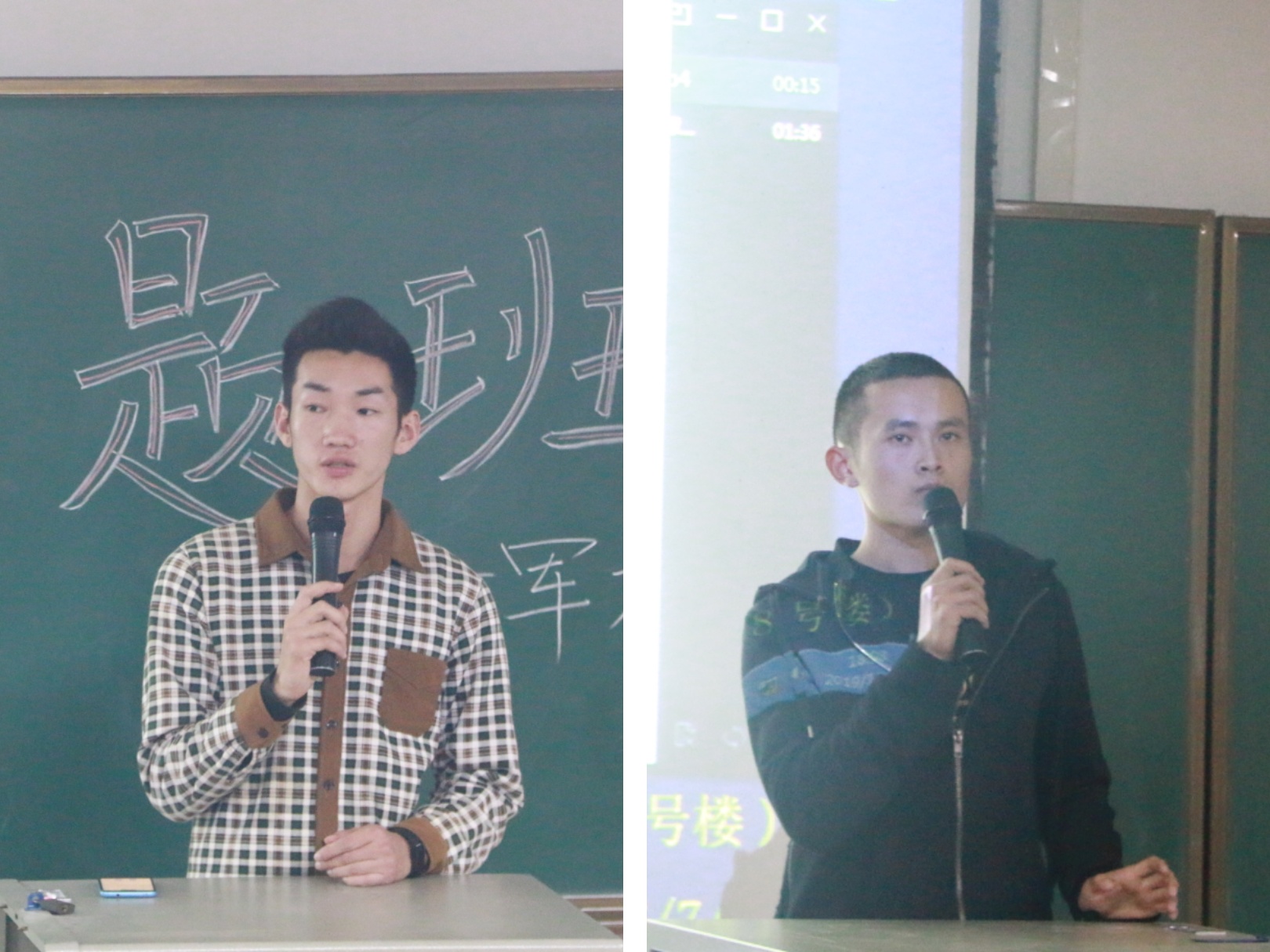 纺织11703班王丰明和纺织51601班梁方文,为同学们分享他们的军旅生活。报告会由纺织11801班朱朝翠同学主持。