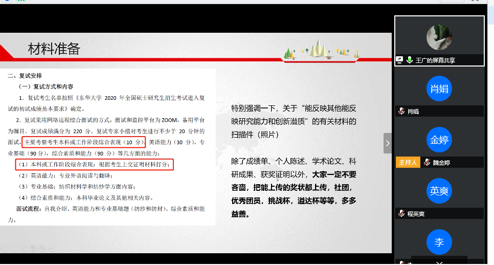 召开线上东华一对一考研复试指导会。东华大学学工处、就业处袁海源老师,毕业年级辅导员魏金婷老师,国产直播