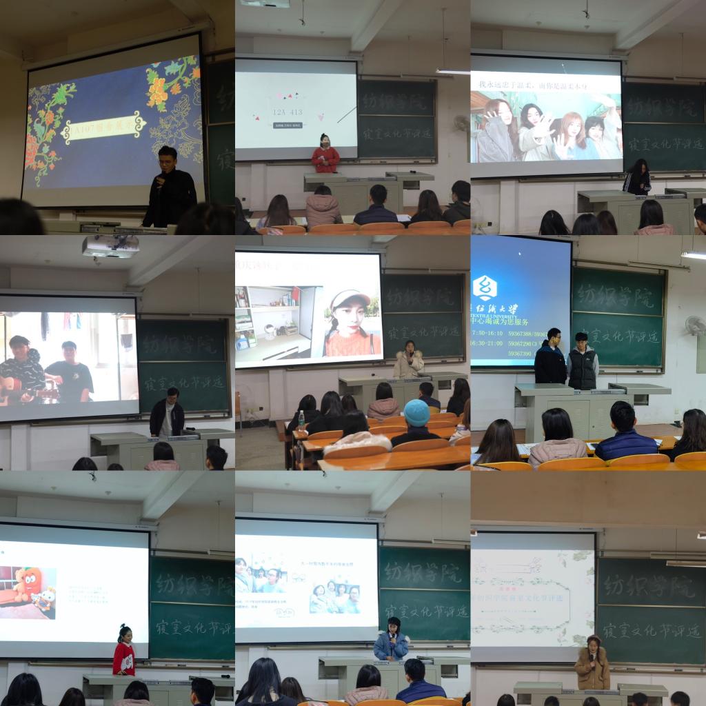 活动伊始,陈海书记对参加决赛的13个寝室表示祝贺,并希望同学们能“营造寝室小家,维护纺织大家”。接下来,参加竞选的各寝室派出代表对制作出的PPT进行演示,介绍了寝室文化,寝室关系,寝室日常和学习目标等内容,充分展现了纺院学子自律的生活,优良的习惯以及远大的人生目标。