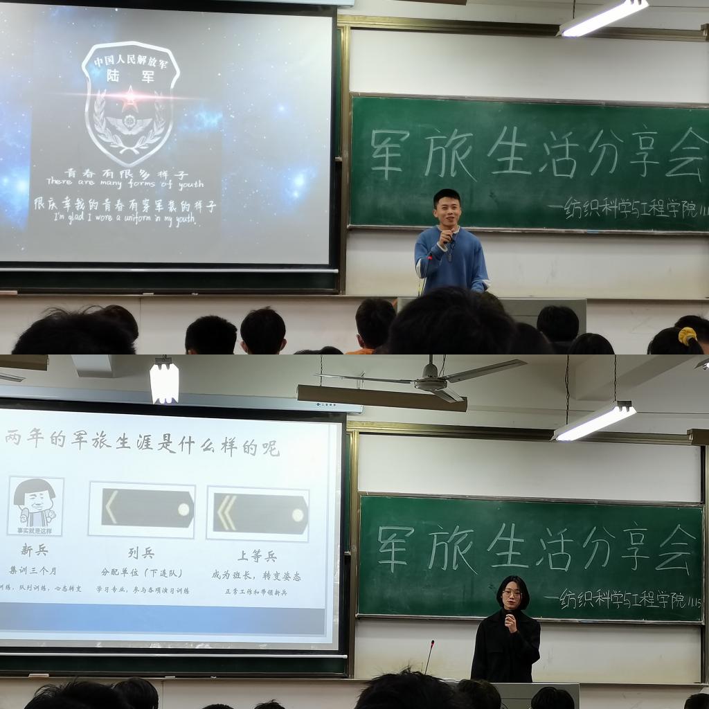 纺织12001班张汶和纺织52003班游子吟为同学们分享他们的军旅生活。报告会由纺织实践部田浩然主持、辅导员严蔷薇、李亮、吴童玲及全体新生参加活动。