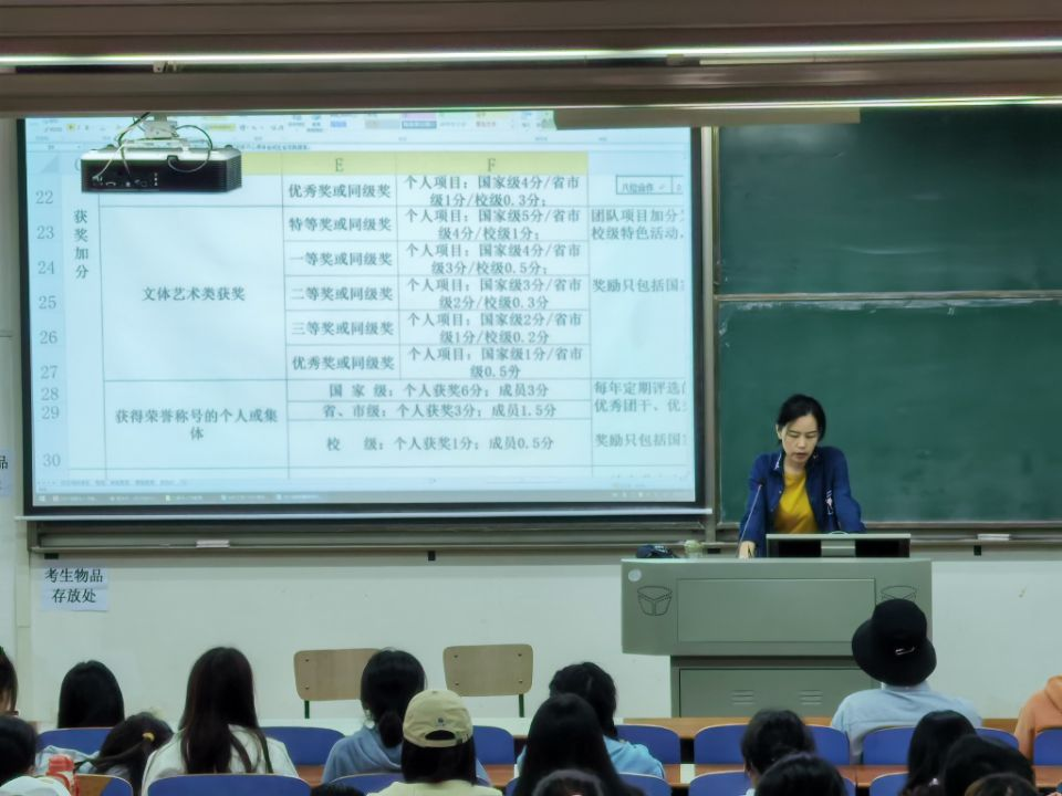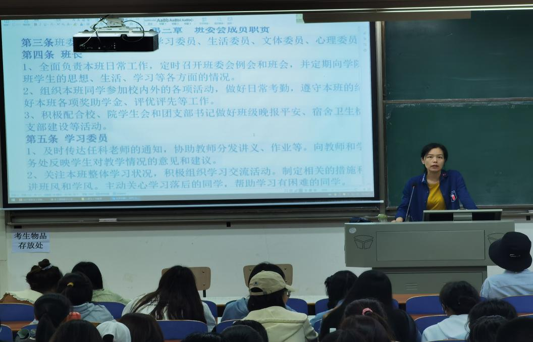 会议伊始严老师详细地为同学们介绍了学校绩点换算,评优评先,推优入党,礼仪及办事等规章制度,让同学们认识到综合素质评分对大学生的重要性。同时严老师也强调了对同学们大学四年的生活的期望,希望大家能够明确自己的目标,做好人生规划,为自己的目标制定更合理的时间安排。随后严老师还重点说明了班委对于班级活动的重要性,介绍了班委所承担的职责,并对班委们的工作表示肯定,鼓励各班班委继续努力,为班级班风的建立做贡献。