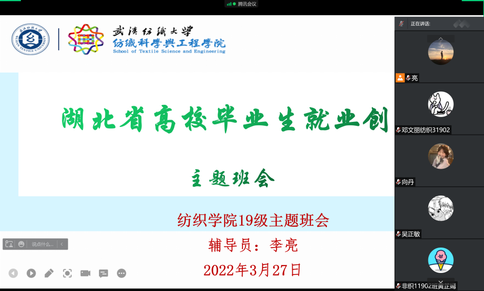 各年级主题班会上,老师们详细了解了疫情期间各班同学的基本情况,强调了学校的防控要求,在校的学生严格履行非必要不外出的承诺,服从和支持学校和学院的统一管理。叮嘱在外工作的学生一定要注意个人防护,遵守疫情防控要求。陈海副书记和18级辅导员严老师向同学们详细介绍了目前的就业形势和学校的就业工作要求,提醒同学们要时刻关注学校的就业网站,积极主动参加网上招聘双选会,及时签订三方协议。此外学院还专门为考研复试的学生准备了5个专门的复试场次,同学们可以根据实际备考情况预约场地。此外,各年级班主任还积极宣讲和解读了就业创业相关政策,鼓励学生建功基层、应征入伍、参加“三支一扶”和“西部计划”,展现新时代中国青年的责任和担当。
