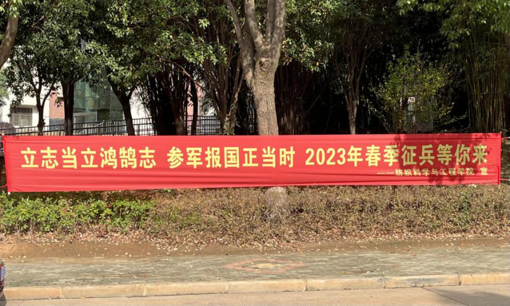 还在学生一栋宿舍以及八栋教学楼下挂设征兵宣传标语,加强征兵宣传效果。