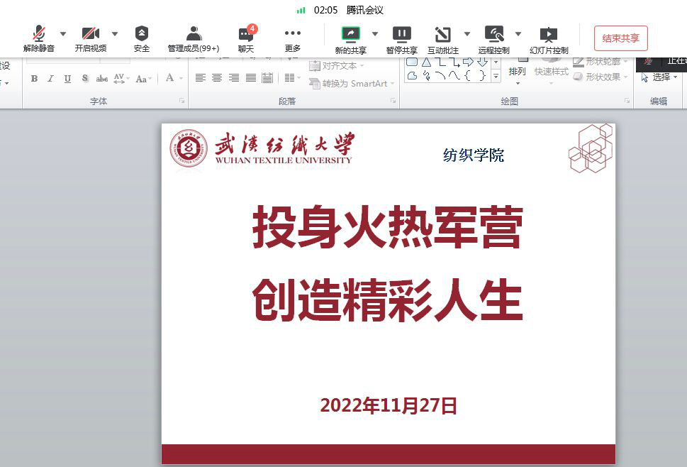 线上开展“投身火热军营,创造精彩人生”的主题班会,班会由19级辅导员李巧中老师主持,李老师先给同学们播放了《火热军营 精彩人生》的征兵宣传片,让同学们感受到祖国国防和军队现代化建设成就,以及新时代军人保家卫国的使命担当。同学们在观看宣传片之后表示感慨万分。纺织11903班李飞表示,青春不止眼前的潇洒,还有家国和边关。“国有难, 邦有危,我辈学子自当投笔从戎",这是战争年代学生们对青春的选择;“把热血挥洒在实现强军梦的伟大实践”,这是和平时期青年对历史的担当。