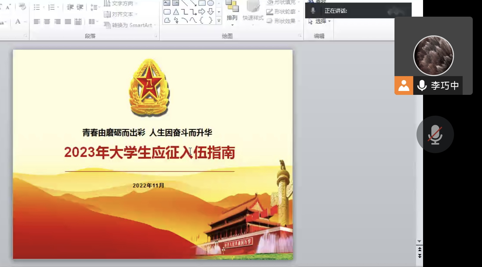 各年级分别在线上开展入伍征兵宣讲,19级辅导员开展全体学生的入伍征兵宣讲,为同学们进行2023春季征兵的政策讲解,李巧中老师强调国无防不立,民无兵不安。大学生征兵工作是治国安邦的大事,是加强国防和军队建设的迫切需求,广大学生要积极响应国家的号召积极入伍。20级辅导员吴童玲从征兵入伍的十大优势及收获、退役士兵的优惠政策、征兵入伍的条件及要求、征兵入伍基本流程四个方面为大家开展政策宣讲。21级辅导员张竣青鼓励同学们抓住机遇,积极响应国家号召,投身军营报效祖国。22级辅导员王然鼓励同学们在军营中历练、为我国建设现代化人民强军中奉献青春热血。