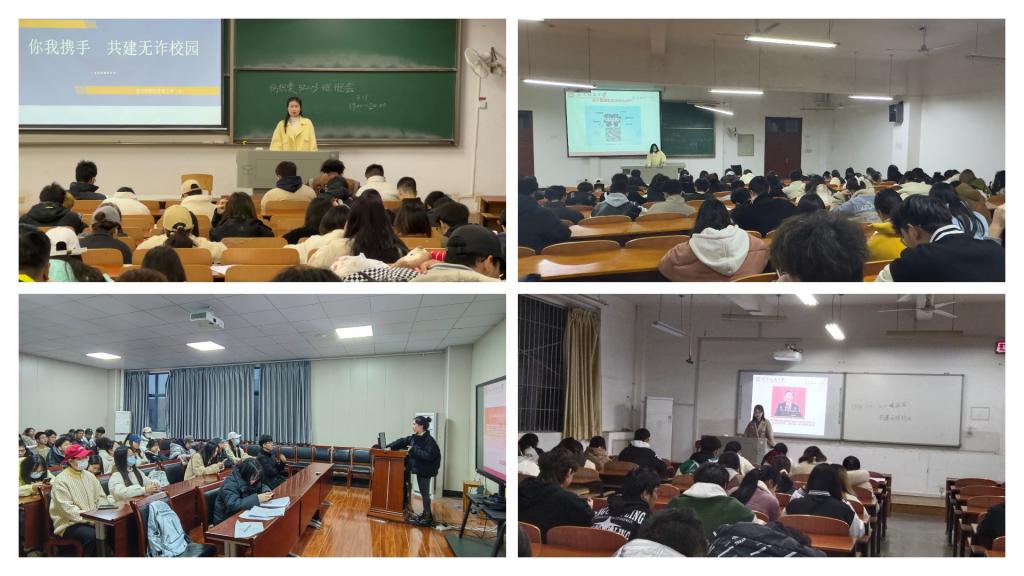 在会议上,主持人主要向学生们分享了习近平总书记在本次大会上发表讲话中的金句,包括习近平总书记对全国人民的承诺、对国家未来发展战略布局的概括以及人民力量与国家发展关系。分享金句旨在让学院学生了解到我国发展最新进展以及接下来国家战略部署的目标,从而明白自己身为当代大学生应当承担的社会责任并积极完善自我、不辱使命。其次就“共建无诈纺大”这一题目,主持人向学生们讲解了有关电信网络诈骗的各种手法并列举国产直播