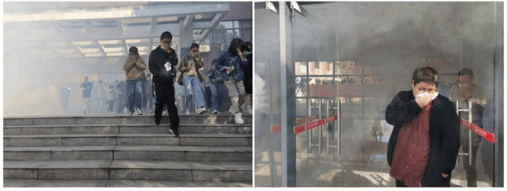 疏散演练指令下达后,8号楼大厅内烟雾腾起,警铃骤响,各位老师、研究生、本科生在分管负责人的组织下,迅速戴好防护用品,从应急疏散通道用湿毛巾捂住口鼻,弯着腰,俯身沿着指定应急通道紧急撤出。