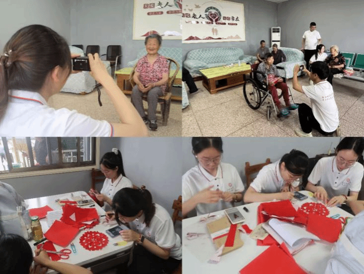 在养老院的大厅里,实践团贴心地用相机为老人们定格美好的瞬间,成员们耐心地引导老人们摆好姿势,用镜头捕捉老人脸上灿烂的笑容。与此同时,实践团的成员为养老院的老人剪窗花、写对联,他们围坐在桌边,用手中的剪刀剪出每一份祝福,一张张包含温情的窗花便在她们手中呈现,成员们将窗花送给老人们,对老人们诉说着“身体安康、幸福如意”的美好祝愿,老人们的脸上洋溢着幸福的笑容。