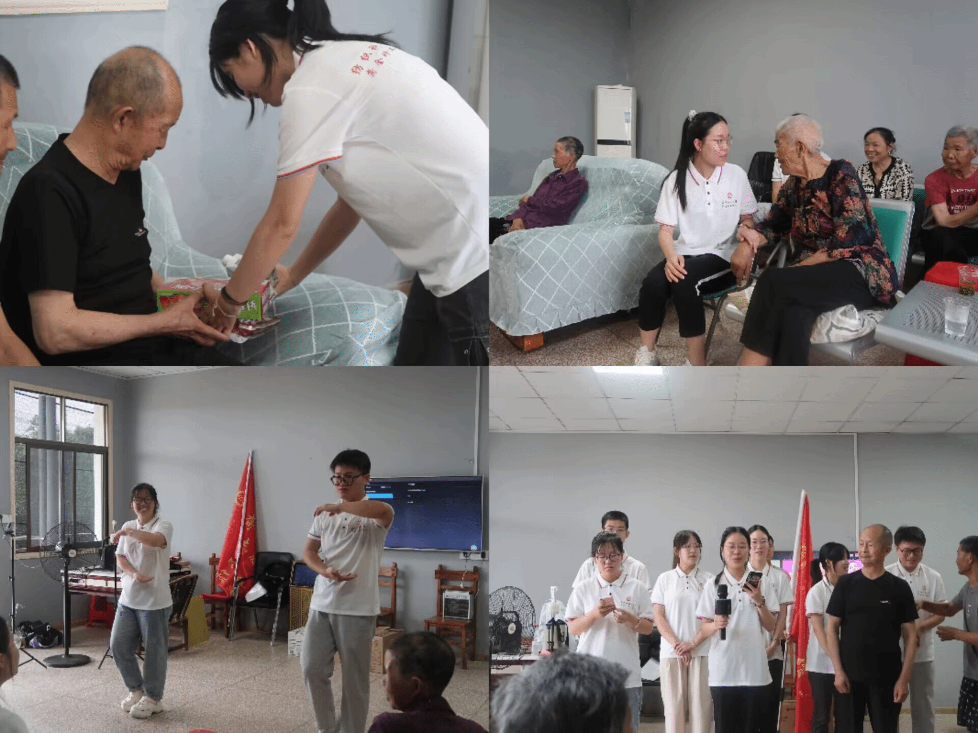 实践团成员们耐心地与老人们聊着家常,亲切地叫他们一声“爷爷、奶奶”,关切地询问他们的生活,倾听他们曾经的故事,为老人提供力所能及的帮助。实践团还为老人精心准备了文艺节目,以此来给老人们送去一份欢笑、一点温暖。实践团成员刘彬岑用清脆悦耳的嗓音唱起《红莓花儿开》,紧接着,江宵和余可欣默契十足地表演起了太极拳,动作行云流水,刚柔并济,展现出中华传统文化的独特魅力。最后,刘智鑫和李金枝同学朗诵《盛世中国》,实践团全体成员和老人们共同唱响《没有共产党就没有新中国》,那一刻,在场所有人的心紧紧相连,一同向中华人民共和国成立75周年献礼。