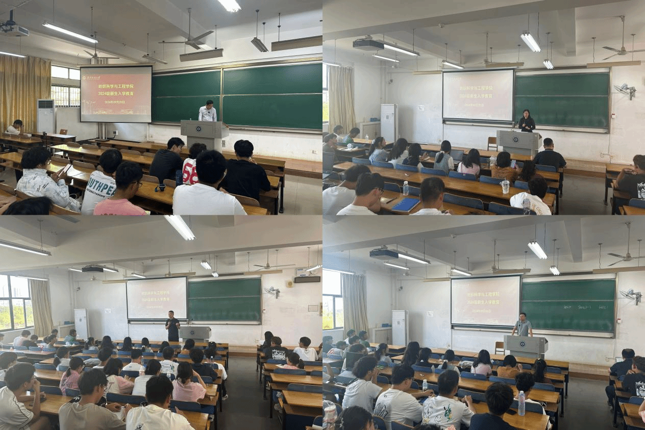 院长蔡光明就学院历史沿革、学院文化、师资队伍、教学科研、学生发展等基本情况进行了介绍。对2024级新生的到来表示热烈欢迎,并对新生们提出了几点期望:一是要发挥纺织特色,扎根特色道路,坚定专业信心。二是要珍惜大学时光,脚踏实地,努力学习专业知识,提升自己的综合素质。三是要积极参与学术论坛,多多聆听专家讲座,为建设“美好纺大”贡献自己的力量。