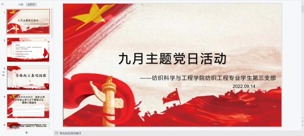 纺织工程专业学生第三支部召开了“喜迎二十大,建设先行区”主题党日活动。学生党支部全体党员参加了会议,支部书记张竣青出席了会议。