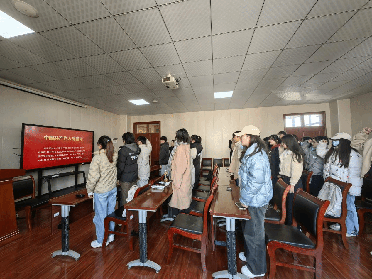 最后,周煜涵作为领誓人带领新发展党员进行庄严宣誓,全体新发展党员面向党旗、右臂举拳,庄严宣誓,以最坚定的声音来表达对党的忠诚与初心,展现全体成员对成为一名好党员的决心和信心。本次会议在庄重而热烈的氛围中圆满结束。