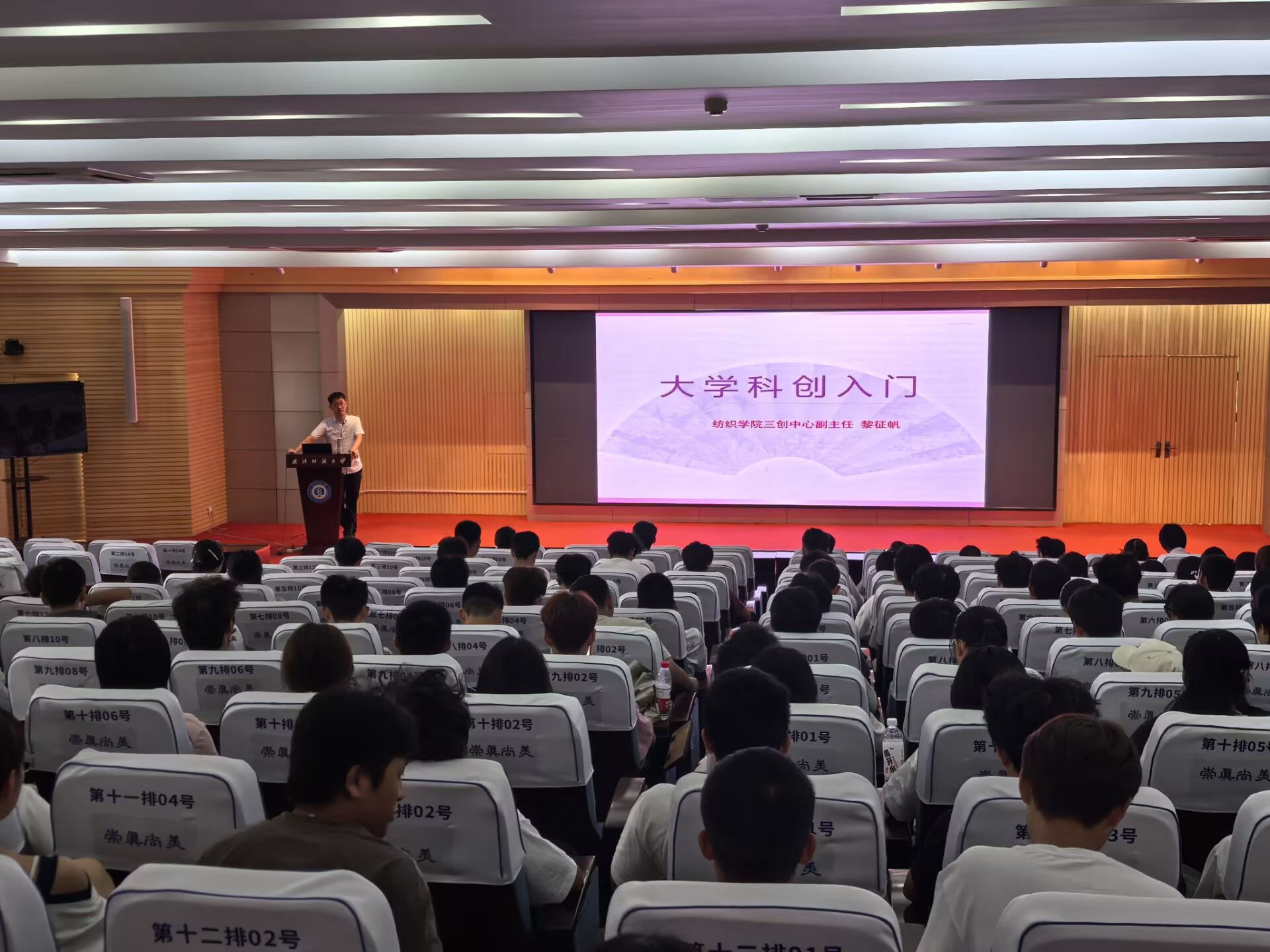 黎征帆老师以“大学科创入门”为题,为新生介绍了学院科创工作体系,并阐述了纺织学子在数字时代的应为与可为。结合具体“挑战杯”、“互联网+”等竞赛的经验,他从信息获取、实验入门、赛事筹备、导师选择等多个方面展开分享,并鼓励大一新生在专注学业的同时,踊跃参与课外实践,实现学术交流、技能拓展与兴趣培养的全方面发展。