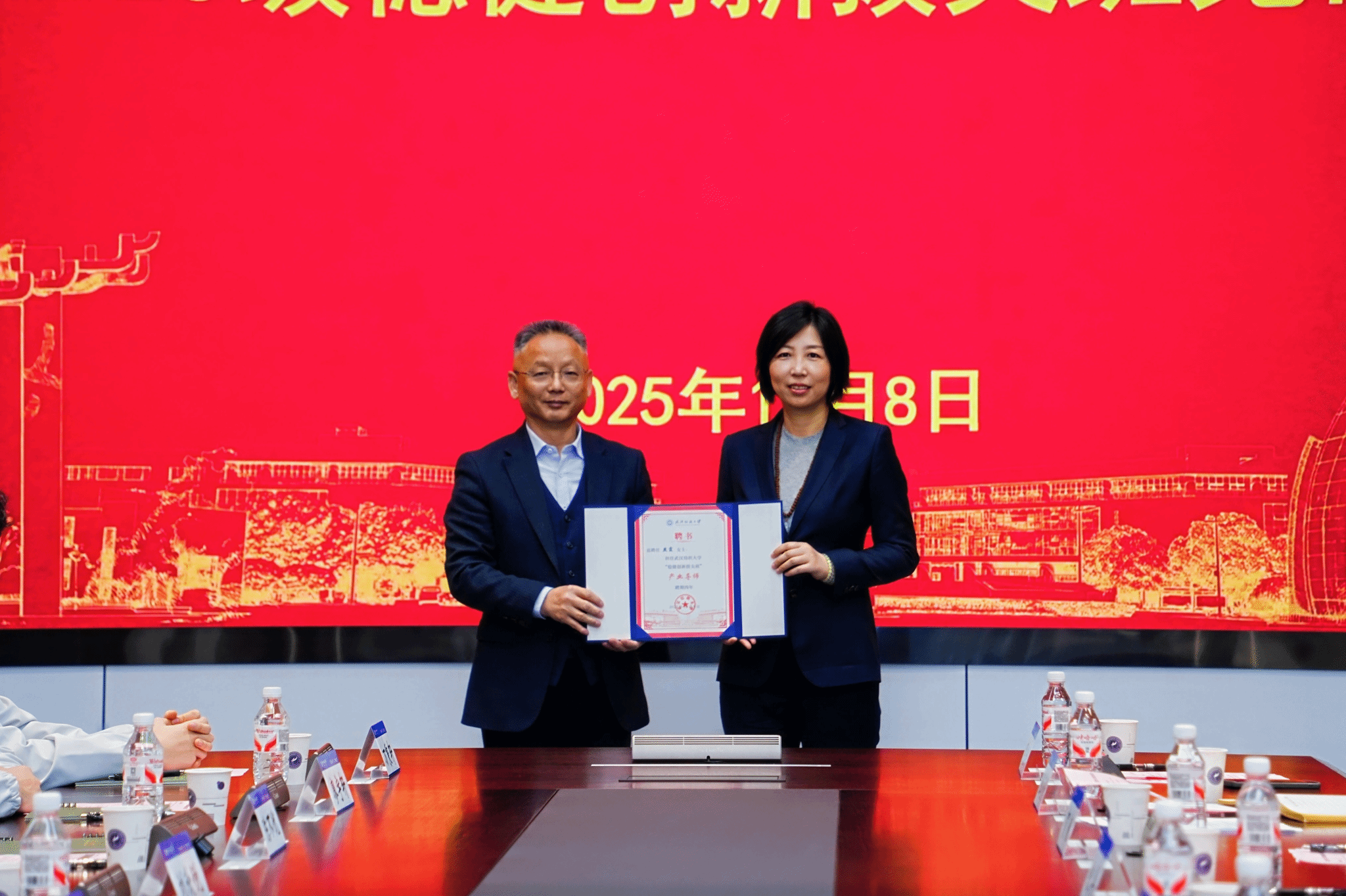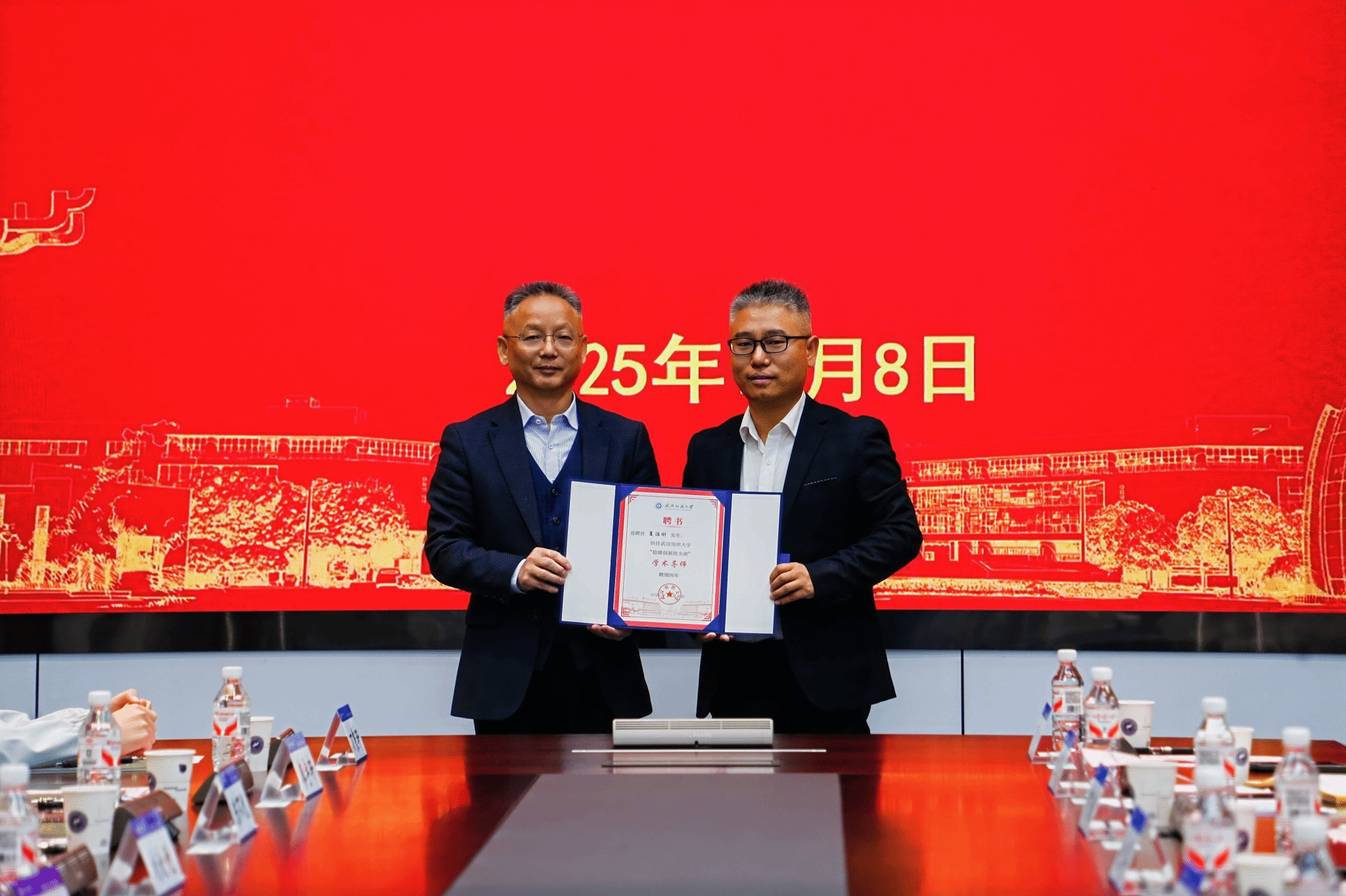 夏治刚教授颁发“学术导师”聘书,为稳健集团轮值CEO燕霞女士颁发“产业导师”聘书。此举旨在构建“学术引领+产业实践”双轨并行的培养体系,由校内顶尖学者与行业资深专家共同指导,为学生提供坚实的理论根基与前沿的产业视野。