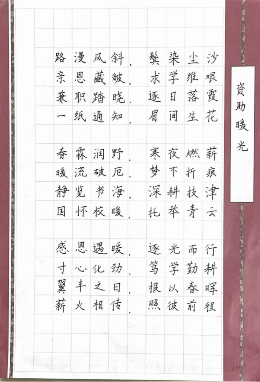 主题活动自启动以来,便在学院内引发热烈反响。参赛作品紧扣“资助伴我,青春启航”主题,同学们结合自身受助经历,用质朴的文字倾诉温暖故事、传递奋进力量。以墨香引领风尚,用担当追逐梦想,用笔尖书写文化,心怀感恩,不忘初心。纺院学子通过精湛的书法技艺,将真挚的情感融入到每一个笔画之中,展现了新时代青年学生的精神风貌和艺术素养。