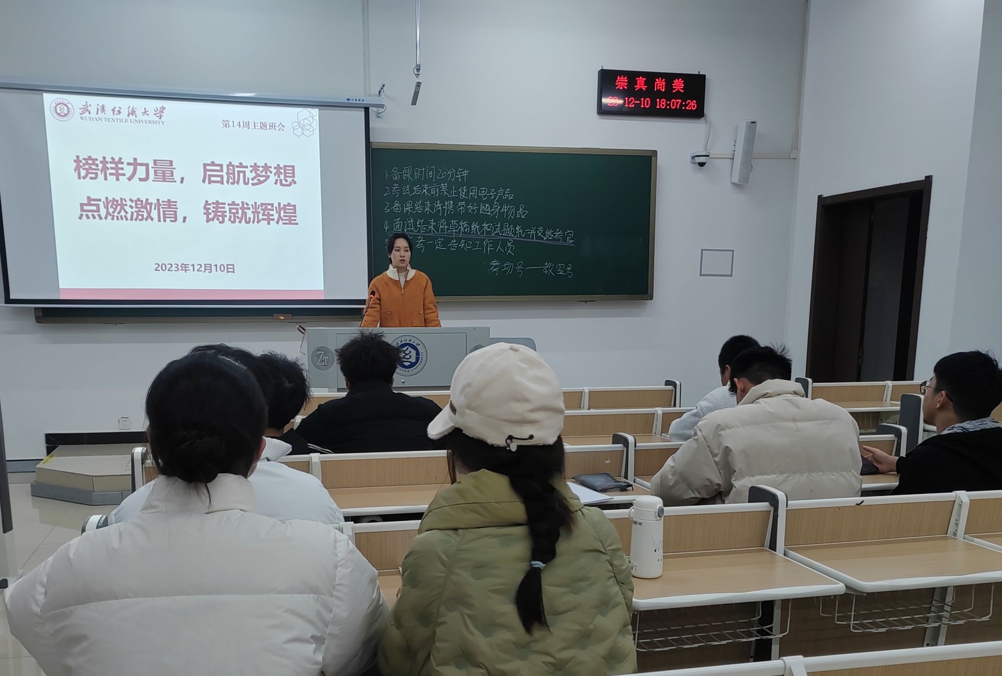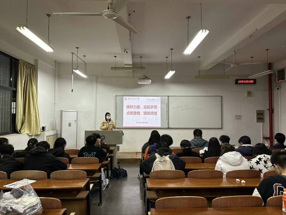 于2023年12月10日开展题为“榜样力量,启航梦想”主题班会,旨在提升同学们的团队协作能力、增强班级凝聚力,提高同学们对维护和谐班级的认知和意识。