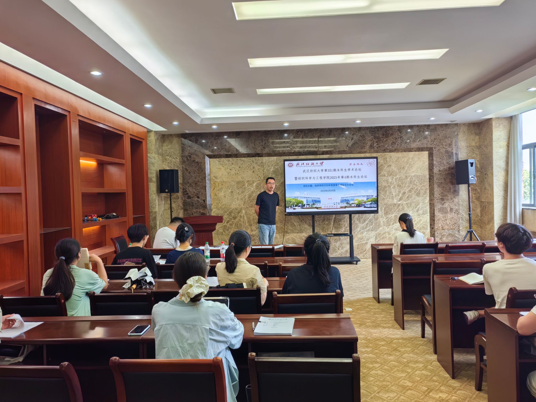 为提高国产直播 毕业设计(论文)质量,充分发挥毕业设计(论文)环节对大学生创新精神和实践能力培养,展现优秀毕业学子学业成果,5月29午,国产直播 第351期本科生学术论坛暨国产直播 2025年“优秀毕业论文(设计)”答辩评审会在8H302成功举行。纺织产品系徐杰老师、非织系胡敏老师、轻化工程系李晖老师担任答辩评委,学院各年级、各专业学生代表到场参与观摩学习。