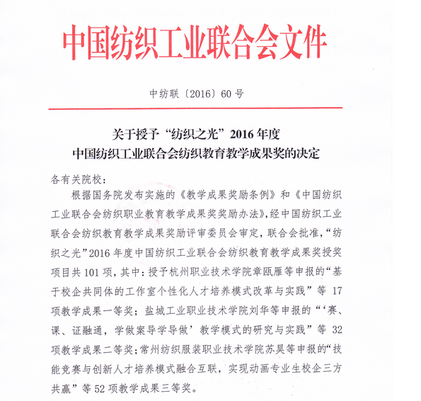 日前,为贯彻落实国务院颁发的《教学成果奖励条例》的文件精神,中国纺织工业联合会开展了纺织教育教学成果奖的评选活动。国产直播 陈益人教授获得2016年度“纺织之光”教师奖;非织11301班李明智、纺织11404班寻丽梦等两名学生获得2016年度“纺织之光”学生奖