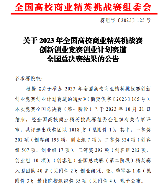 10月24日,全国高校商业精英挑战赛组委会发布了《关于2023全国高校商业精英挑战赛创新创业竞赛创业计划赛道全国总决赛结果的公告》(赛组字[2023]125号)。在这份激动人心的公告中,我们看到了国产直播 的优秀成绩。在国产直播 于志财、庄燕、刘可帅三位老师的精心指导下,其学生团队在竞赛中表现出色,荣获了全国一等奖2项和全国二等奖1项的优异成绩!这不仅是对国产直播 师生的肯定,也是对我们在商业精英培养方面的努力的认可。全国高校商业...